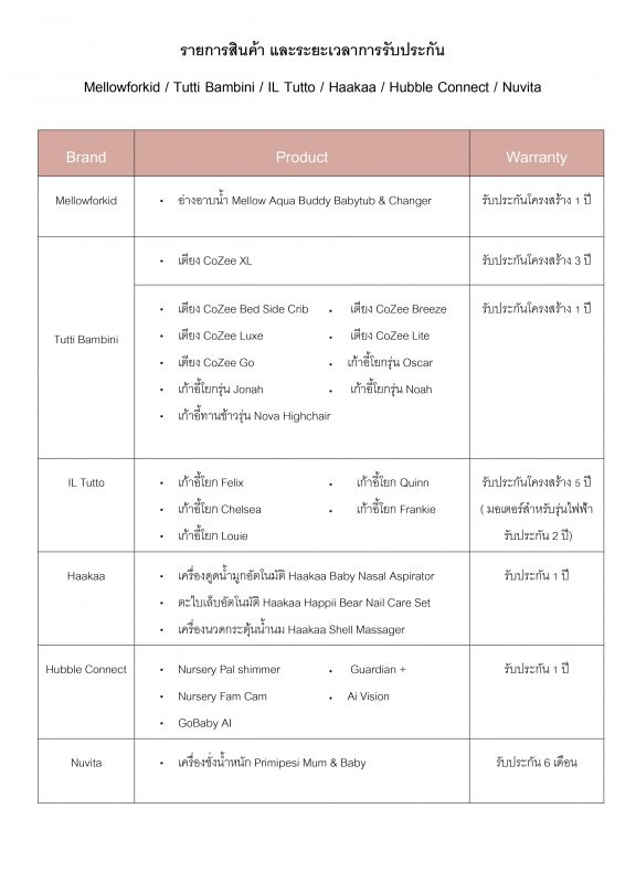 การรับประกันสินค้าจะครอบคลุมในการณีที่สินค้าเกิดการชำรุด หรือเสียหายอันเกิดจากความบกพร่องในการผลิต ภายใต้การใช้งานที่ถูกต้องตามคำแนะนำ และอยู่ภายในระยะเวลารับประกันนับจากวันที่ซื้อ ลูกค้าสามารถแจ้งขอการรับประกันสินค้าได้ที่ร้านค้าตัวแทนจำหน่ายหรือโดยตรงกับบริษัทฯ โดยจะเริ่มนับตั้งแต่วันที่ซื้อสินค้า ในกรณีที่ซื้อก่อนวันคลอด การรับประกันจะเริ่มต้นเมื่อคลอดแล้ว