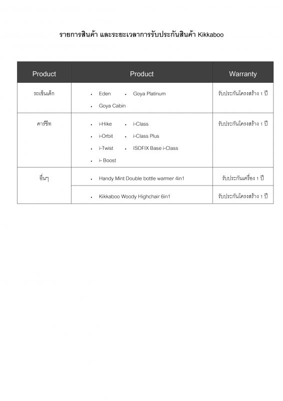 - สินค้าประเภทรถเข็นเด็ก: รับประกันโครงสร้างเป็นระยะเวลา 1 ปี สำหรับความบกพร่องจากกระบวนการผลิต โดยเริ่มนับตั้งแต่วันที่ลูกค้าซื้อสินค้า หรือหากซื้อก่อนวันคลอด การรับประกันจะเริ่มต้นเมื่อคลอด