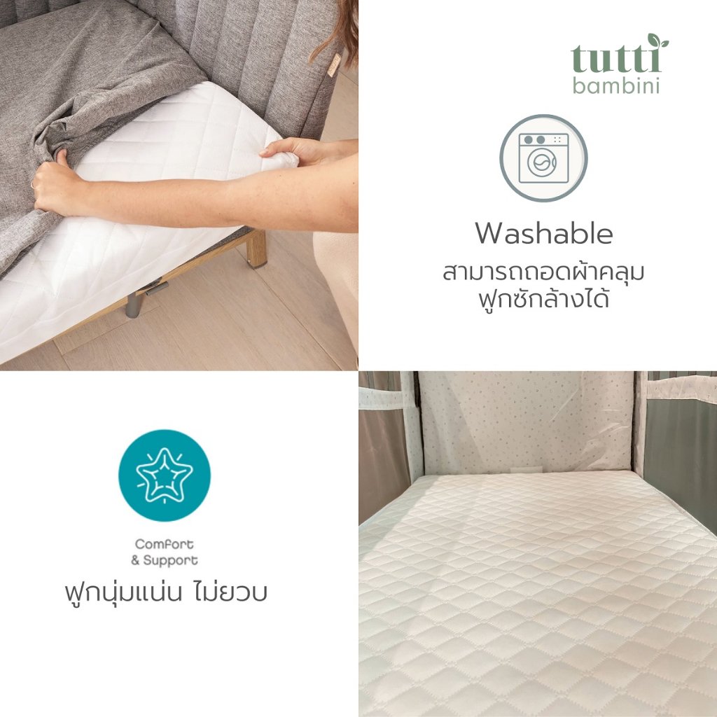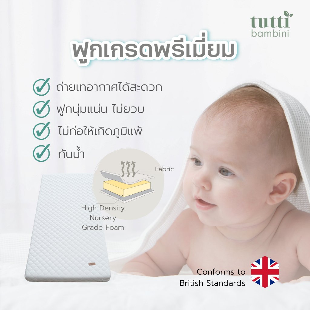วัสดุด้านในเป็น Premium Foam หุ้มด้วยผ้านวมแบบนุ่ม ทำจากผ้าเฟรชเทค ช่วยป้องกันไรฝุ่น และสามารถระบายการได้ดี อายุการใช้งาน 1-2 ปี ขึ้นอยู่กับน้ำหนักของเด็กแต่ละคน